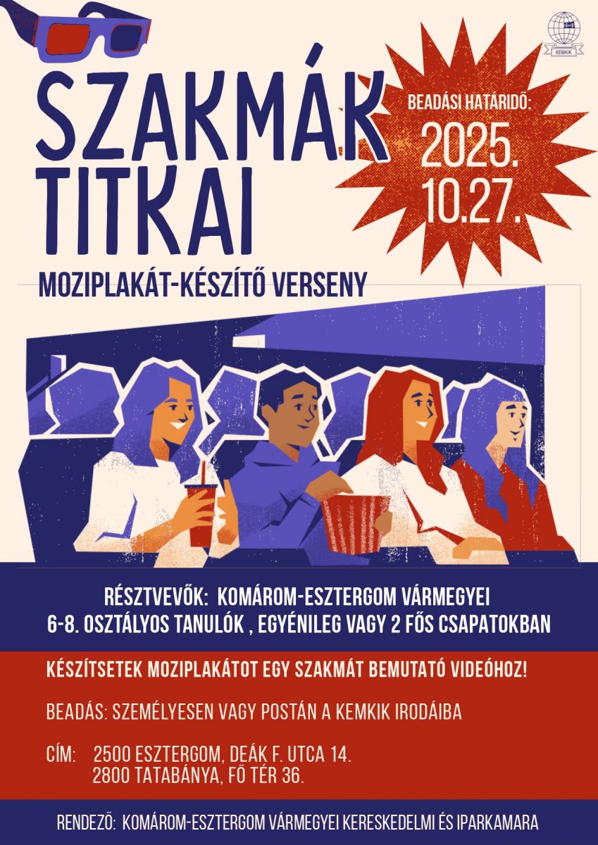 A Komárom-Esztergom Vármegyei Kereskedelmi és Iparkamara „SZAKMÁK TITKA” címmel moziplakát készítő pályázatot hirdet általános iskolai 6. – 7. - 8. osztályos tanulók részére. A versenykiírás célja, hogy megismerkedjetek a szakképzéssel és a szakmák világával.