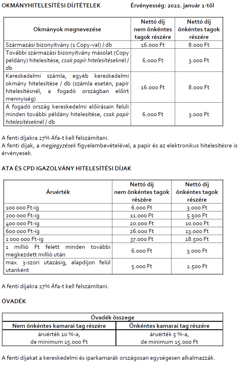 3.2.) Az egyes okmányhitelesítési szolgáltatások díjtételeit az MKIK Elnöksége határozza meg, melyeket évente felülvizsgál, az így egységesen megállapított díjtételek és az előírt mértékű óvadék alkalmazása kötelező.
